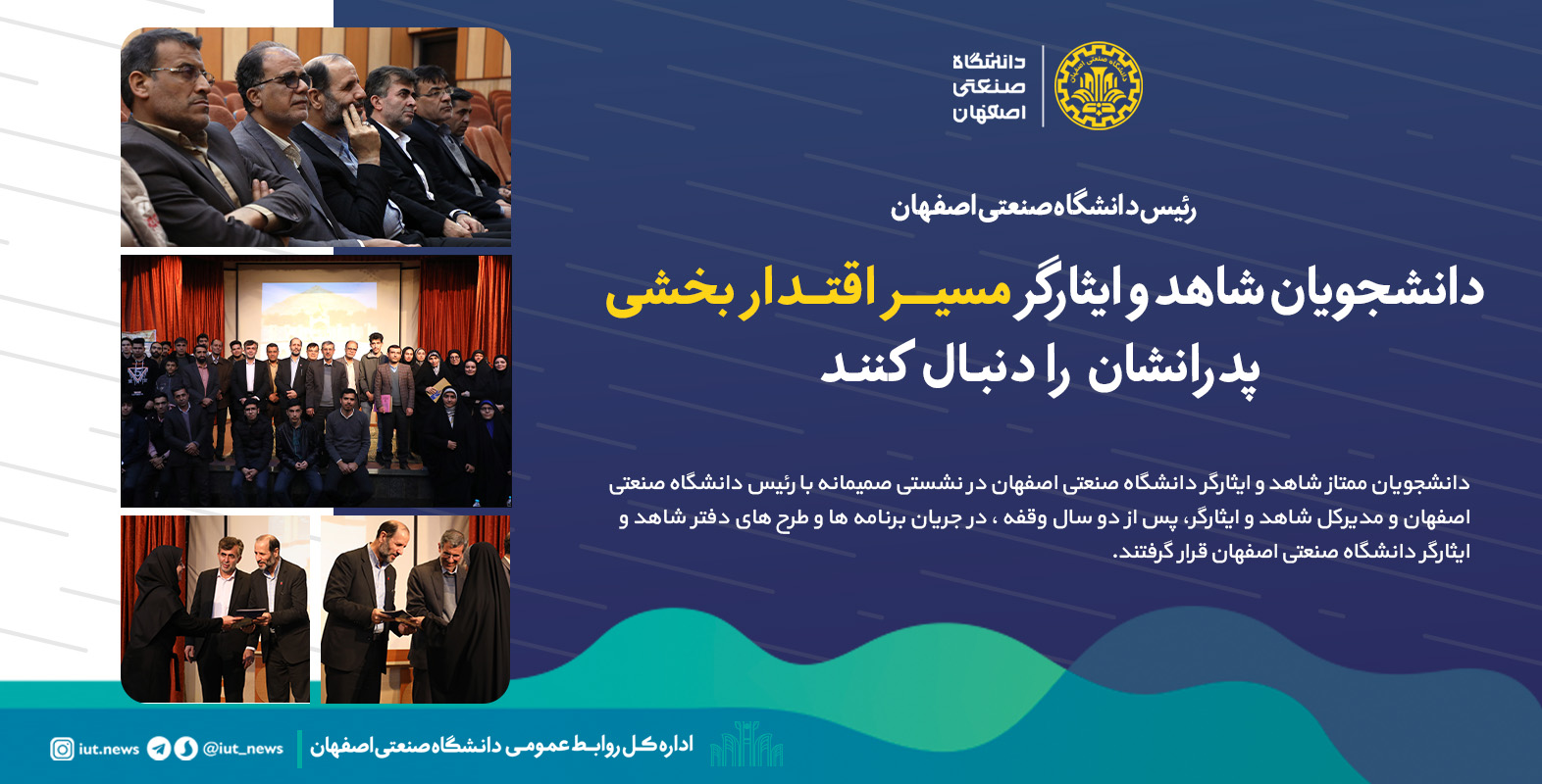 گفتنی است در این نشست بنیاد شهید و امور ایثارگران استان اصفهان از 28 دانشجوی مقاطع کارشناسی و تحصیلات تکمیلی دانشگاه صنعتی اصفهان با رتبه های ممتاز تحصیلی تقدیر به عمل آورد.